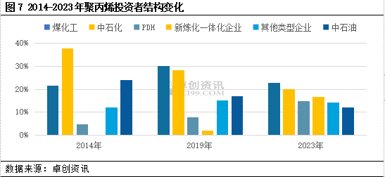 近10年,国内投资者格局逐渐呈现出中石化、中国油、煤化工企业、轻烃化工企业及新炼化企业共同竞争的局面,尤其是后三者在近10年当中快速成长、壮大令国内聚丙烯投资主体多元化竞争更加激烈。随着2014年前后国内煤制聚丙烯技术的落地及丙烷脱氢项目的突破,聚丙烯多元化的技术路线进入门槛不断降低。数据显示,2019年煤化工产能占比达到30%,已超越中石化成为聚丙烯主要供应力量之一,而PDH企业占比也达到了7.7%。