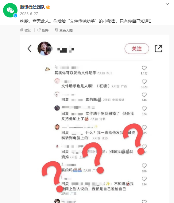 微信的文件传输助手是微信自带的功能,也是用户日常高频使用的功能之一,传文件、写备忘都会用到文件传输助手,往上面发包含个人隐私文件、图片的情况也很常见。2023年曾传言文件传输助手背后是“真人”,有网友称自己被文件传输删除了,但是自己又加上了,对此腾讯微信团队作出辟谣,“抱歉,查无此人,你发给文件传输助手的小秘密,只有你自己知道。”
