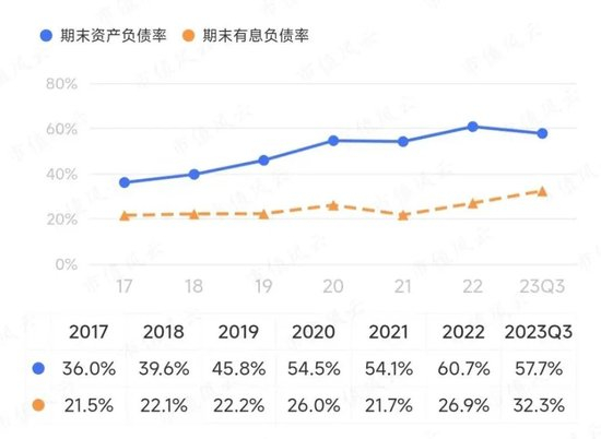 2021年末至2023年中,其资产负债率自54.1%提升至58.6%,有息负债率自21.7%上行至31.7%,有约10个百分点的增幅。