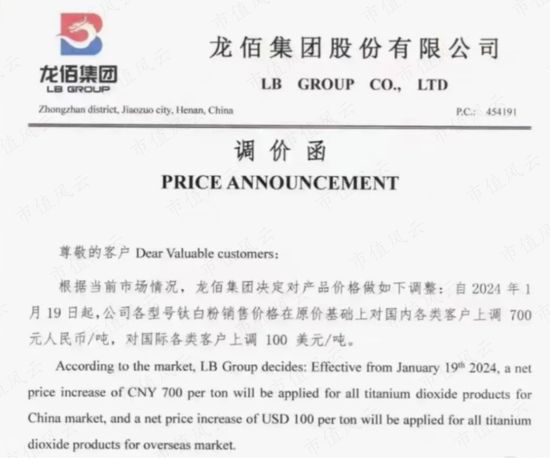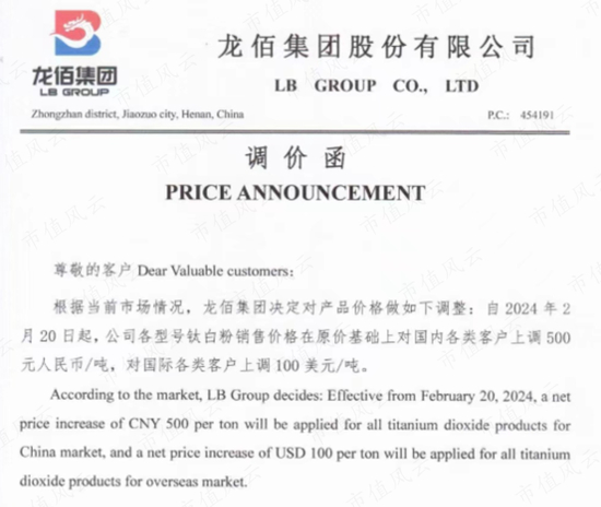 2月20日,钛白粉行业的龙头龙佰集团(002601.SZ)向客户发布调价函,宣布从2月20日起对国内、国际客户的每吨售价分别上调500元人民币、100美元。