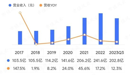 进入2023年后,前三季度营收增长12.3%,增速逐年放缓。