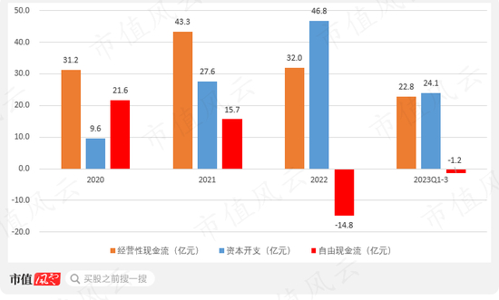 产能大举扩张支撑起产量的同时,大量的资本开支也拖累了龙佰集团的现金流,2022年其自由现金流净流出约15亿,与此前年份的大幅流入形成鲜明对比。