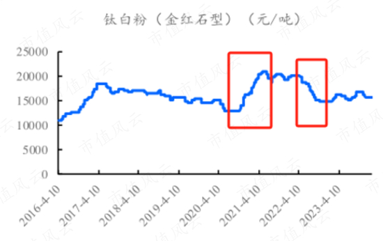 以市场主流的金红石型为例,先是自2020年下半年起飞速增长,至2021年中每吨价格突破20,000元,此后这一高价维持至2022年中,随后又回落至15,000元附近并保持至今。