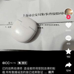 2月20日晚,女主播CC在短视频平台发布一张“上海市公安局案(事)件接报回执”照片,文案中,她写道,“已约谈两名律师,造谣者终将受到法律的制裁,所有散播谣言的皆已取证结束,一个都跑不掉。”2月21日,CC再次发布澄清视频提到,她已进行司法取证,将交由相关部门处理。截至发稿时止,她没有回复新京报记者的采访请求。