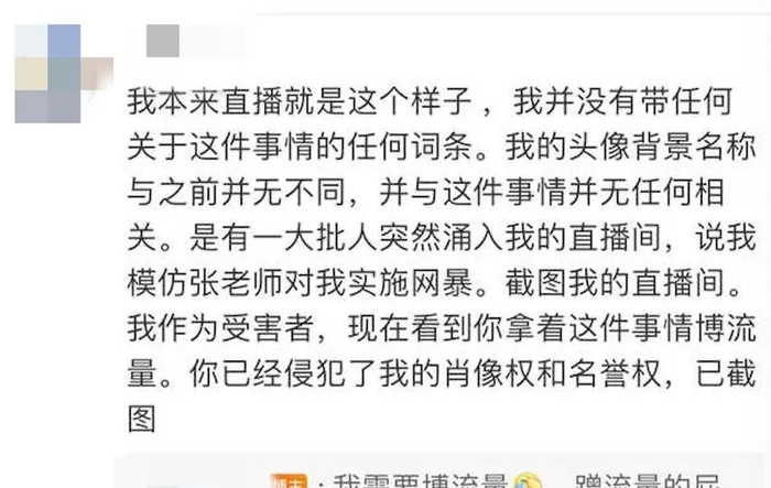 一遍遍自证清白无果后,她很无力地发现,“没有用,没有人听”,当网友认定她是在蹭“女老师”的热度,说什么都没有用。满屏都是“主播蹭流量无下限”,薛冉一个一个拉黑这些网暴她的人,但根本拉黑不过来。