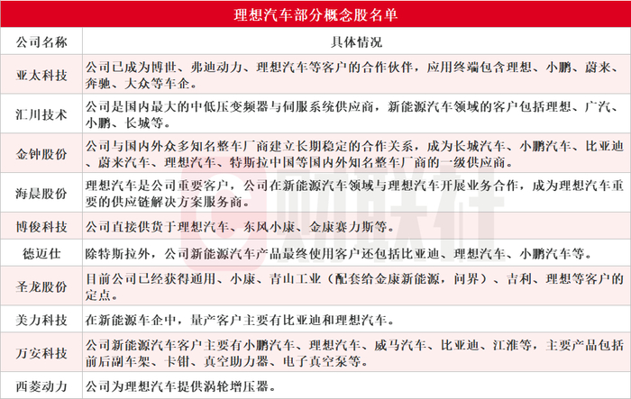 据不完全统计,除上述公司以外,涉及理想汽车相关业务的上市公司还有亚太科技、汇川技术、金钟股份、海晨股份、博俊科技、德迈仕、圣龙股份、美力科技、万安科技、西菱动力等,具体情况如下: