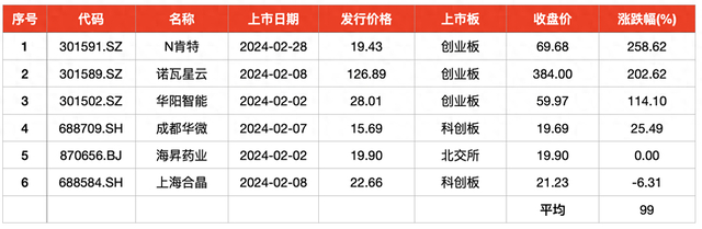 2月新股上市首日成绩单出炉:平均涨99%,一签赚2.84万