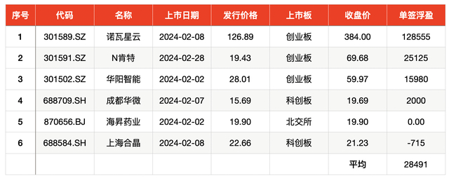 根据澎湃新闻统计,以上市首日收盘价计算,2月上市的6只新股,投资者平均中一签浮盈达28491元,环比1月的7623元翻2倍以上。