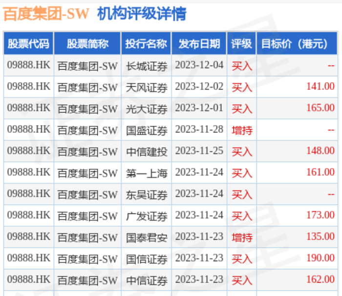 相较往年,在2023年大模型浪潮背景下,百度获得了更多投资者的关注。Wind数据显示,年内共有逾百家机构给予百度集团-SW“买入”评级,逾30家给予“增持”或“跑赢行业”评级。目前,包括法国巴黎银行、花旗、瑞银、高盛、美银、摩根大通等十余家顶级机构对百度的评级均为“买入”,其中摩根大通对百度的目标股价定位215美元,以2月27日收盘股价计算,百度股价尚有近100%的潜在上升空间。