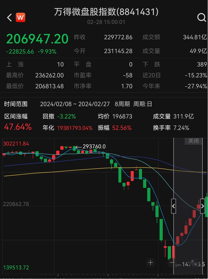 2月28日,A股早盘冲高回落,尾盘加速跳水,微盘股指数跌近10%。沪深两市今日成交额13567亿,较上个交易日放量3667亿,成交金额创两年多新高。不过值得注意的是,北向资金较为淡定,全天净买入13.4亿。