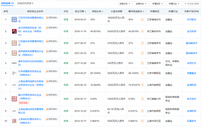 洋河对外投资基金早前主要通过旗下全资子公司苏酒集团江苏财富管理有限公司开展,2018年,洋河股份与该公司共同出资设立江苏洋河投资管理有限公司。