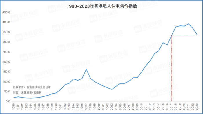 2023年,香港房价指数跌至337.4,相比2022年,房价已经下跌8.7%。