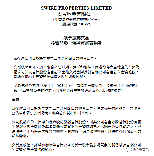 公告显示,陆家嘴集团、前滩投资于2023年8月1日分别将其持有的东袤公司40%股权、耀龙公司40%股权在上海联合产权交易所公开挂牌转让,挂牌价格分别为65.94亿元、31.16亿元。截至2023年8月29日,上述股权项目分别征集到意向方锦洋有限公司和联峰有限公司,以上意向方均为太古地产有限公司的全资子公司。经考虑公司战略规划,陆家嘴拟放弃行使上述股权转让的优先购买权。