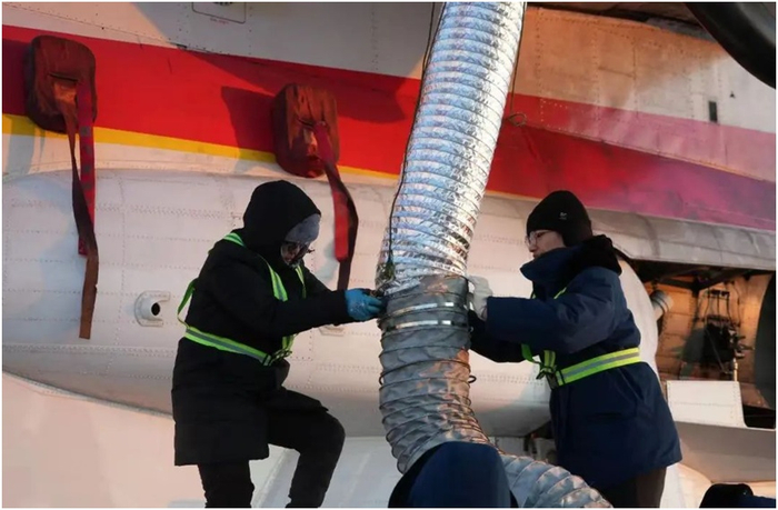 航空工业通飞华南试飞中心机务大队负责人郭佳带着8名机务与航空工业试飞中心机务大队一起,负责此次低温试飞试验的机务场务保障。团队需要每两小时启动一次发动机,而启动前还需要先给飞机装上两个约80斤的机载电源,开车完成后,再将电源拆卸下来,再抬回暖库保存。一晚上,值班的七八个人需要来来回回5次。