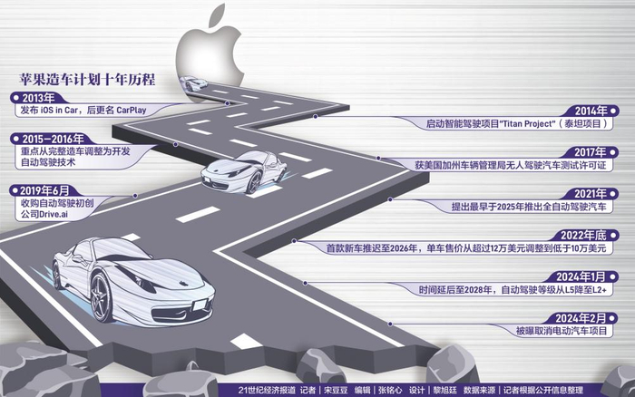 “由于库克是守业型的CEO,要对投资者充分负责,苹果与特斯拉背后的投资者其实是理念不同的两类人。如果苹果和其投资者审时度势作出决定,及时终止汽车项目也是一种理性选择。”2月28日,汽车行业分析师钟师在接受21世纪经济报道记者采访时表示,“任何造车卖车的盈亏率上限都是能预测出来的,毕竟这还是一个传统行业。但方兴未艾的AI市场规模之大和美好远景是无法预测的,苹果舍弃造车赛道而切换到AI最符合苹果和其投资者的商业逻辑。”
