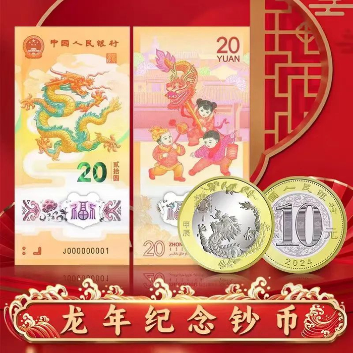 龙年纪念钞(面值20元)、龙年纪念币(面值10元)、2024年两张龙年小版票都有,还特别加入了迎接新世纪双连体龙钞纯金纪念版。