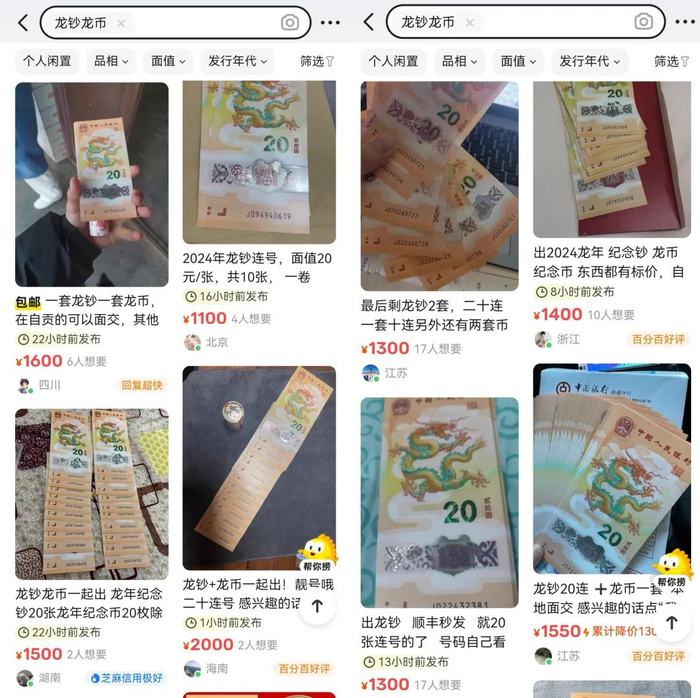 面额20元,与同面额人民币等值流通,加上今年既是闰年,又是甲辰龙年,百年一遇,难怪价格一天一个样。