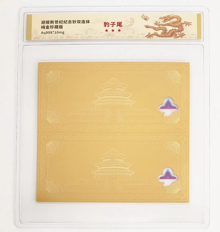 2、珍藏版新世纪双连体龙钞,10mg999足金,中国人民银行许可发行。