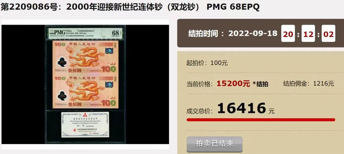 在收藏界,千禧龙钞的珍贵性不言而喻,面值100元,在某拍卖平台上,一张“千禧龙钞”拍出4510元,更别说双连体了。