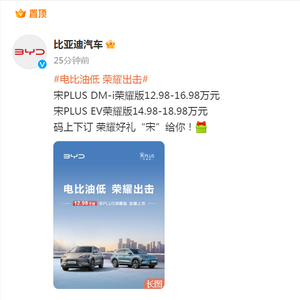 2月29日,比亚迪汽车(002594.SZ,股价189.18元,市值5507.3亿元)发布微博称,宋PLUS DM-i荣耀版12.98-16.98万元;宋PLUS EV荣耀版14.98-18.98万元。