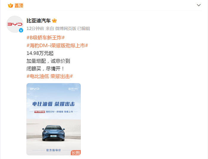 同时,比亚迪还推出B级轿车“新王炸”——海豹DM-i荣耀版劲爆上市,14.98万元起。