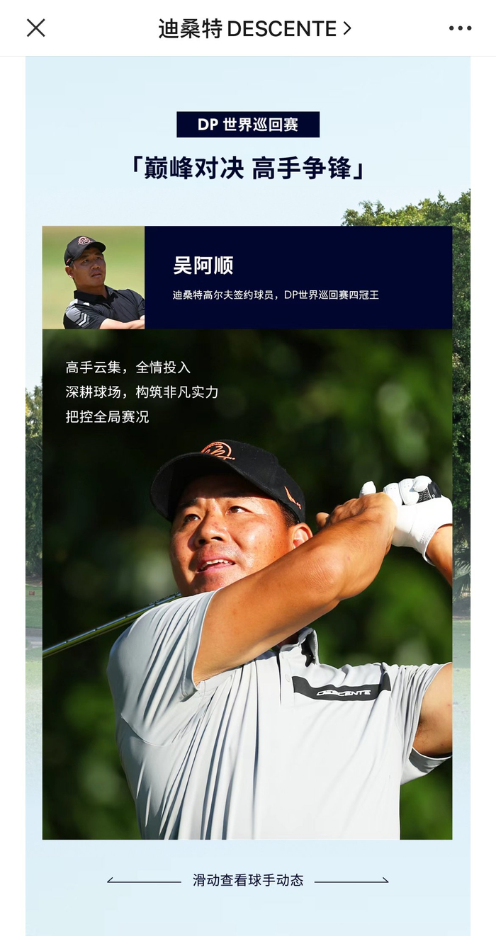 迪桑特在微信公众号上分享了即将参加PGA TOUR美洲巡回赛、DP世界巡回赛以及LPGA锦标赛的旗下签约高尔夫球运动员及品牌代言人们。这些国内外运动员身着迪桑特子品牌“DESCENTE GOLF(迪桑特高尔夫)”的球服出现在过往的高尔夫赛场上。在这些运动员中,中国女子高球运动员刘钰是2023年被迪桑特高尔夫签约的。