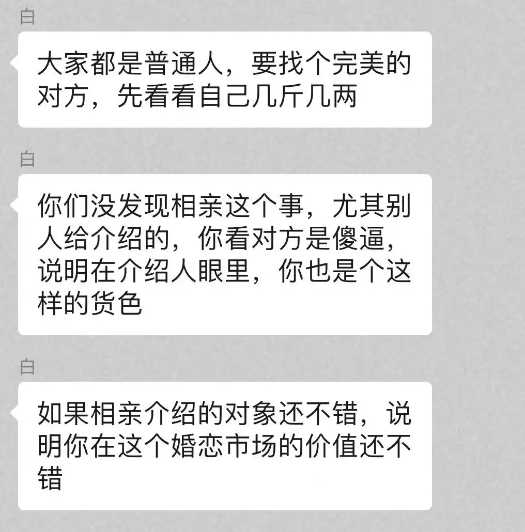 一旦进入相亲市场你就成为了一件商品,单位是升值空间,爹妈是品牌溢价,连子宫也有使用年限,我还没到30就有相亲对象担心我会不会生育困难。