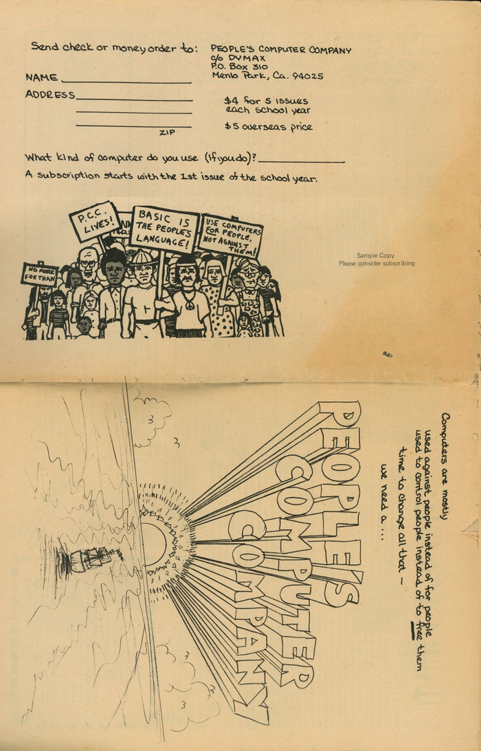 "Computers are mostly used against people instead of for people; used to control people instead of to free them; Time to change all that - we need a... Peoples Computer Company."
