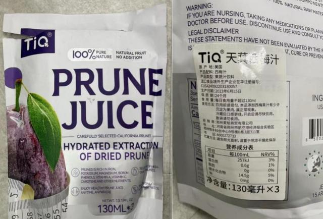 据了解,天萁西梅汁的进口食品中文标签显示,产品配料为“西梅汁”,保质期为“24个月”,食用量为“每日食用量不超过130ml”。TiQ官方旗舰店宣称,该产品0添加,不含任何助泻成分。