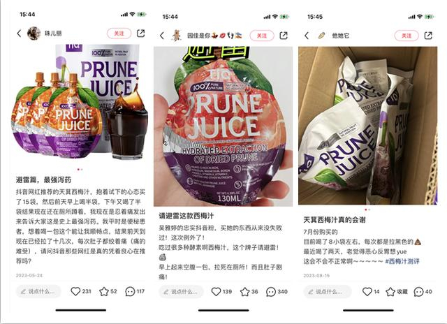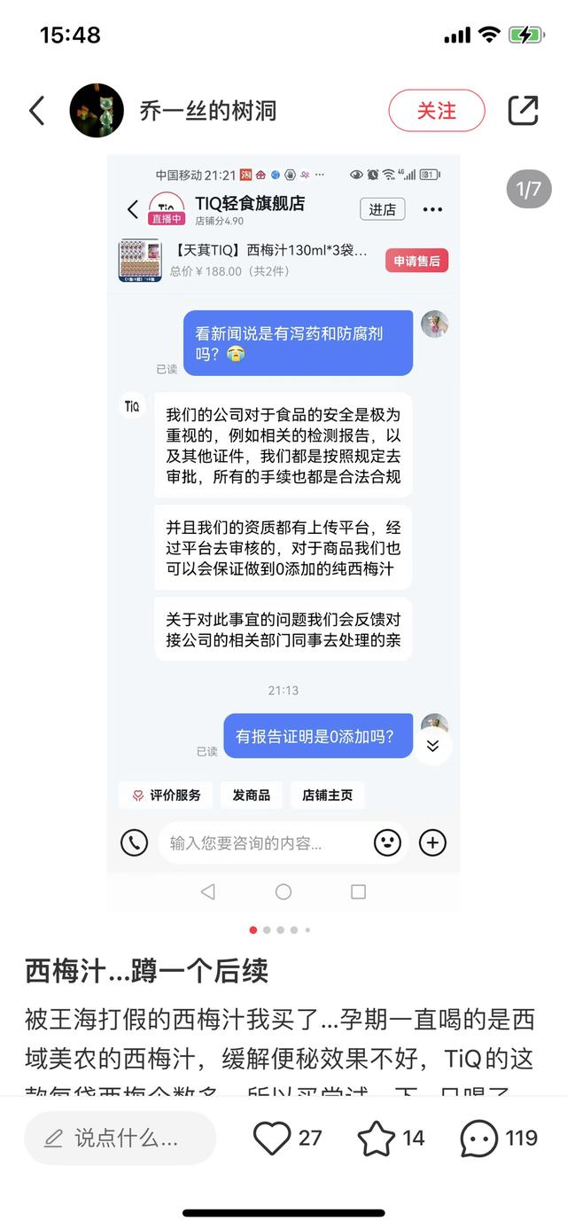 记者在淘宝搜寻,发现TiQ官方旗舰店已终止经营,暂未发现其他店铺有天萁西梅汁身影。而在小红书平台,早在2023年上半年,就有网友吐槽,食用天萁西梅汁后出现了严重的腹痛、腹泻、恶心、反胃等情况。在王海团队爆料后,TIQ官方旗舰店客服曾回应消费者,“所有手续合法合规,保证做到0添加”。