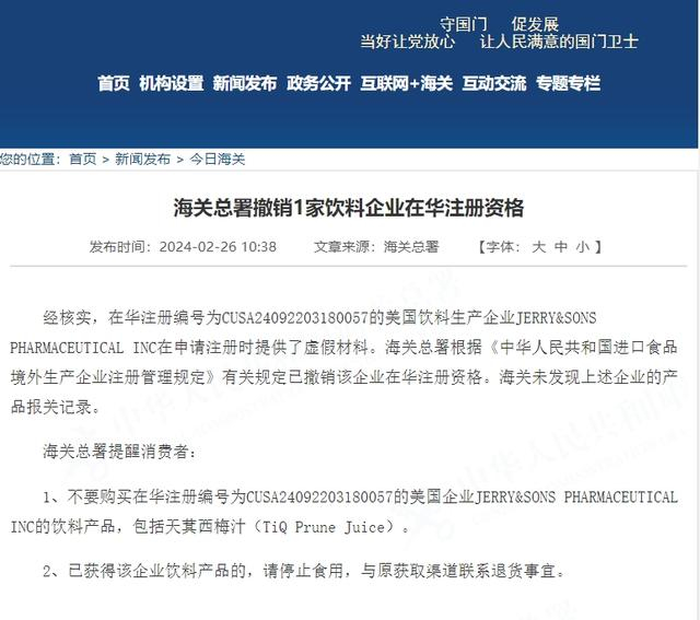 海关总署官网2月26日发布消息称,美国饮料生产企业JERRY&SONS PHARMACEUTICAL INC因在申请注册时提供虚假材料,现已撤销该企业在华注册资格,并提醒消费者不要购买该企业的饮料产品,包括天萁西梅汁(TiQ Prune Juice)。