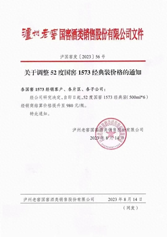 在2023年里,面对疲软的市况,泸州老窖曾经多次停货稳价,并于3月份和8月份分别上调了38度和52度国窖1573经典装的出厂价,希望以此来稳定市场,同时提振渠道信心,更希望能借此在高端名酒阵营中赢得稳定站位。