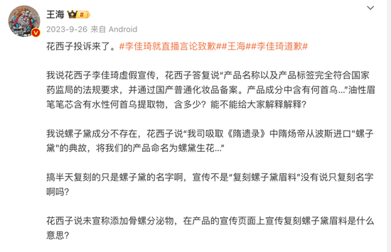 小杨哥之外,罗永浩、李佳琦也在王海的狙击范围内。去年李佳琦带货花西子眉笔引发争议时,王海就在微博称“花西子李佳琦虚假宣传”,表示螺子黛成分不存在。随后,花西子在宣传页面修改文案,将“本品复制螺子黛”更改为“本品灵感来源于螺子黛”。