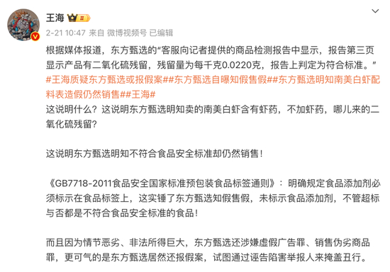 2月18日,春节返工第一天,王海就在微博爆料,东方甄选销售的自营厄瓜多尔南美白虾,隐瞒添加并超量使用了虾药(防腐剂、漂白剂)焦亚硫酸钠。东方甄选回应媒体时称送检结果符合国标要求。另一媒体引用知情人士称,东方甄选已报警处理。对于上述消息,字母榜向东方甄选方面求证,截至发稿,东方甄选未予回应。