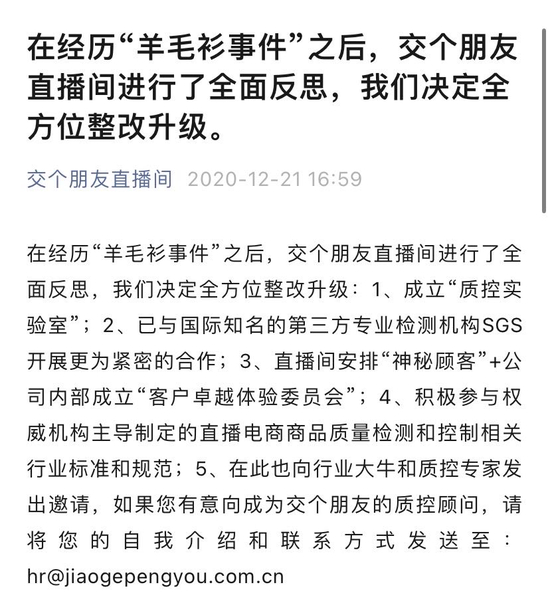 事后,交个朋友还提出了五项整改措施:成立质控实验室;与国际知名的第三方专业检测机构更紧密合作;进行自查行动;参与权威机构主导制定的直播电商商品质量检测和控制相关行业标准和规范;请行业大牛和质控专家成为交个朋友的质控顾问。