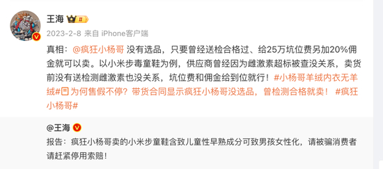 东方甄选也并非被王海打假最多的头部主播。自2022年以来,疯狂小杨哥被打假的次数不下十次。在微博有207万粉丝的王海,目前其微博置顶的便是举报疯狂小杨哥售卖“毒童鞋”的微博。