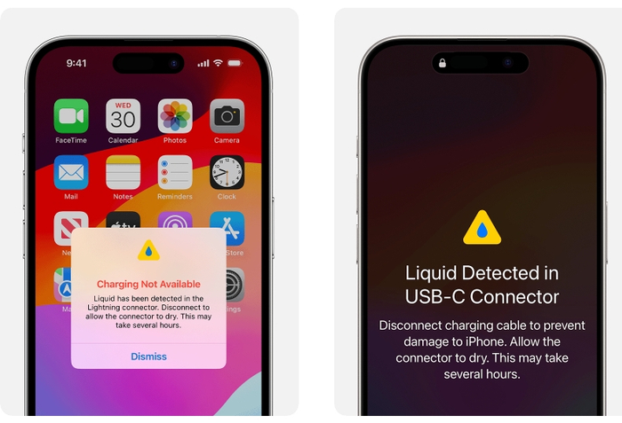 该文档中指出,将lightning连接线、USB-C连接线或是配件连接到iPhone XS、iPhone XS Max、iPhone XR或更新机型时,如果接口中有液体,iPhone会发出警告。为了保护iPhone和配件,在接口、线缆两端和配件干燥之前,将无法充电和连接配件。