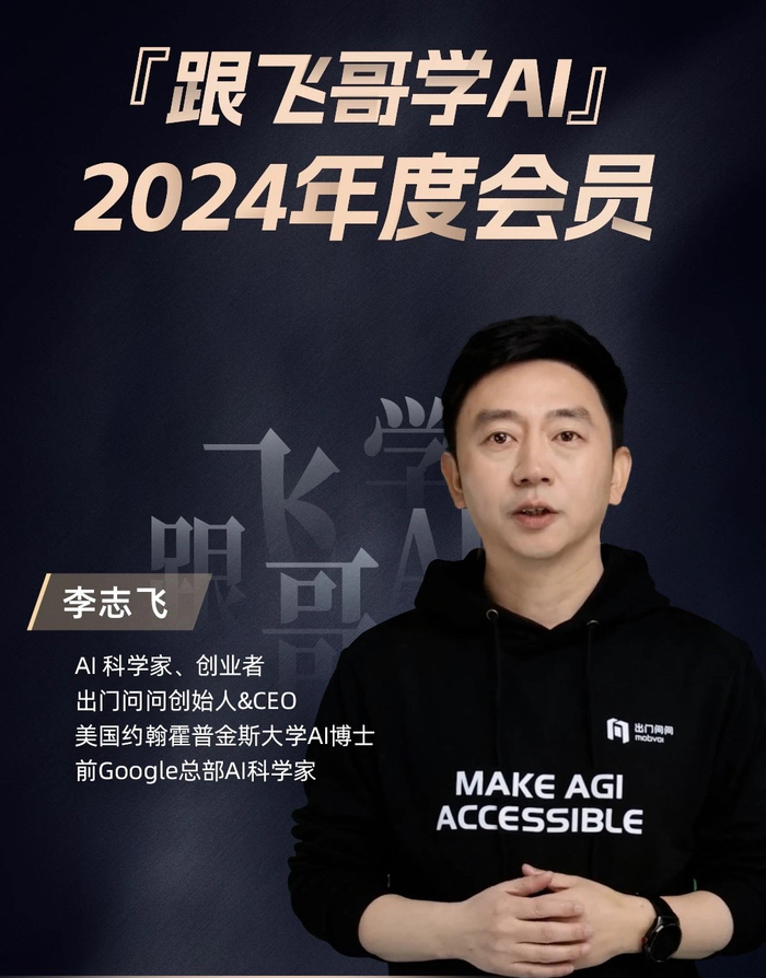 2月29日,AI科学家、出门问问创始人李志飞在自己的公众号“飞哥说AI”上发布了一则会员招募文章,开始销售自己的AI课程。宣传页面显示,课程费用为2999元一年,包含会员专属研讨会12场,加入专属社群以及获得一些线下活动参与资格,包括线下研讨会、跨年大课、1v1咨询、私董会等。