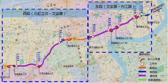 计划2024年上半年东段主线具备通车条件。北横通道东段主线通车后,标志着北横通道实现主线全线贯通,将进一步改善沿线交通出行环境,缓解区域道路通行压力,为沿线区域与虹桥枢纽间提供一条新的快速通道,服务北部重点地区的中长距离到发交通,助力构建长三角区域一体城际交通网。此外,北横通道对沿线苏州河北的长风生态商务区、曹家渡商圈、新客站、苏河湾、北外滩等重点发展地区有着很大的带动作用,对于连接虹桥、浦东两大机场,服务长三角经济带的发展,都具有重大意义。