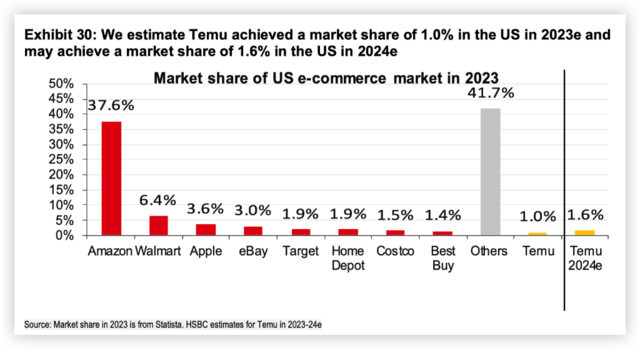 据汇丰估计,在美国、欧洲和亚洲的发达市场,Temu有望获得3-6%的市场份额。2023年,Temu贡献了拼多多总收入的23%,2024年这一数字有望升至43%,并在2025年超过50%。