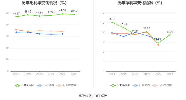 2023年,公司毛利率为48.92%,同比下降0.46个百分点;净利率为11.22%,较上年同期上升2.40个百分点。从单季度指标来看,2023年第四季度公司毛利率为48.50%,同比上升0.68个百分点,环比上升0.27个百分点;净利率为10.45%,较上年同期上升2.34个百分点,较上一季度上升0.89个百分点。