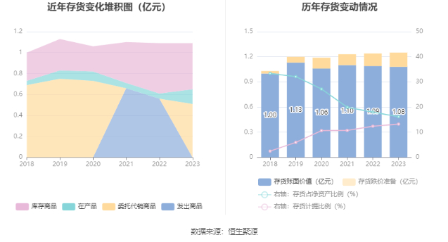 从存货变动来看,截至2023年年末,公司存货账面价值为1.08亿元,占净资产的16.17%,较上年末减少18.69万元。其中,存货跌价准备为1654.22万元,计提比例为13.24%。