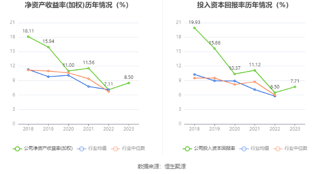 数据显示,2023年公司加权平均净资产收益率为8.50%,较上年同期增长1.39个百分点;公司2023年投入资本回报率为7.71%,较上年同期增长1.21个百分点。