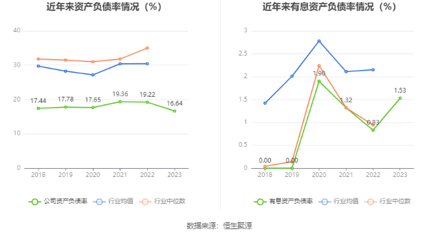 在偿债能力方面,公司2023年年末资产负债率为16.64%,相比上年末下降2.58个百分点;有息资产负债率为1.53%,相比上年末上升0.70个百分点。