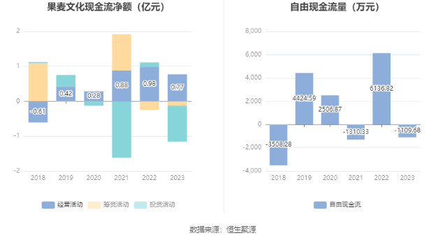 进一步统计发现,2023年公司自由现金流为-1109.68万元,上年同期为6136.82万元。