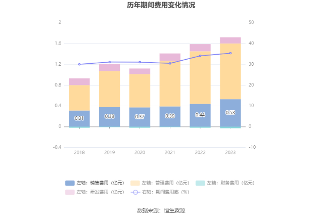 2023年,公司期间费用为1.69亿元,同比增长1157.07万元;期间费用率为35.37%,同比增长1.28个百分点。其中,销售费用同比增长19.2%,管理费用同比增长5.4%,研发费用同比下降9.99%,财务费用-275.47万元,去年同期-169.58万元。