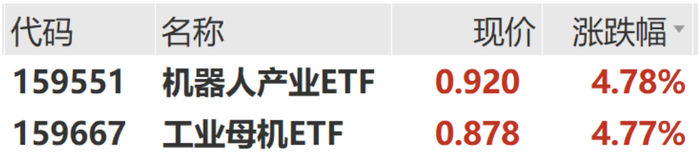 高端制造板块2月29日也表现强劲,机器人产业ETF(159551)、工业母机ETF(159667)均涨超4.7%。