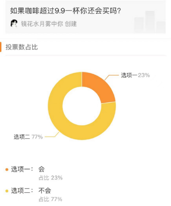 此前微博上公布了一份名为“如果咖啡超过9.9一杯你还会买吗?”的投票,有占比77%的消费者表示:不会。
