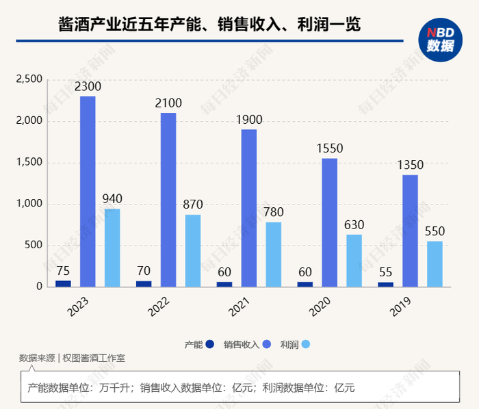 前述《报告》显示,2019年至2023年,5年时间里,中国酱酒产能从55万吨增长至75万吨,销售收入由1350亿元增至2300亿元,利润由550亿元增长至940亿元。
