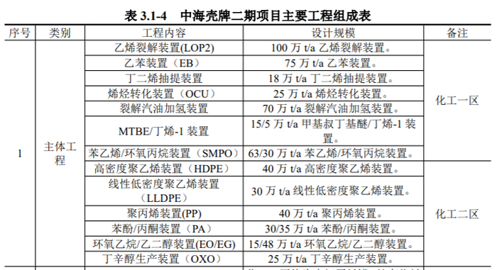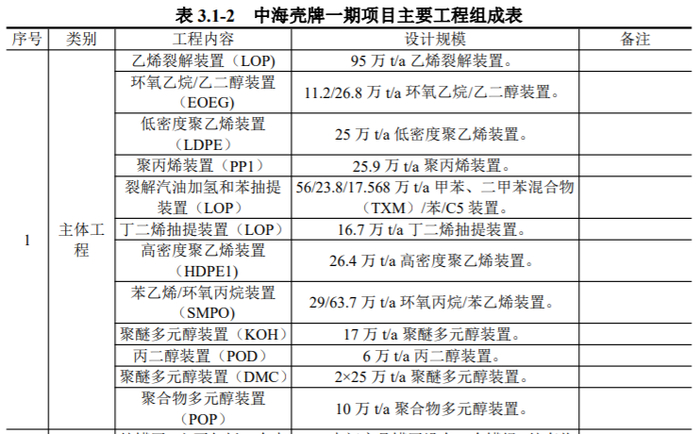 建设规模:本项目共建设16套生产装置,包括160万吨/年乙烯装置、30.5万吨/年丁二烯抽提装置、146万吨/年裂解汽油加氢装置、110万吨/年芳烃抽提装置、64.5万吨/年环氧乙烷-乙二醇(EO-EG)装置、60万吨/年茂金属线性低密度聚乙烯(mLLDPE)装置、40万吨/年线性α-烯烃(LAO)装置、13万吨/年异构化及歧化(ID)装置、13万吨/年壳牌氢甲酰化(SHF)装置、5万吨/年聚α-烯烃(PAO)装置、50万吨/年聚丙烯(PP)装置、100万吨/年乙苯(EB)装置、87.5/40万吨/年苯乙烯-环氧丙烷(SM-PO)装置、45万吨/年聚醚多元醇(DMC-POD)装置、10万吨/年聚合物多元醇(POP-POD)装置、27/8万吨/年MTBE/丁烯-1装置,及配套的储运工程、公用工程、辅助工程、环保工程等。